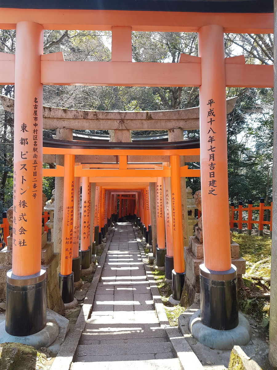 Il s'agit d'un sanctuaire dédié aux divinités qui protègent l'agriculture (les kami inari). Il s'élève sur une colline proche de Kyoto, et l'ascension d'une heure se fait au milieu des tori, ces arches en bois orangé que des particuliers ou des entreprises financent et dédient à ce sanctuaire (ça leur permet aussi de faire un peu de pub puisqu'on grave leur nom dessus !).